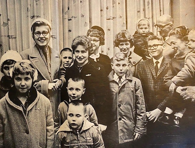 The ‘Baker Nine’ in 1962. L-R: Loretta Baker, Susan Baker, Sally Jo Meyers, Jim Meyers, Jerald Baker, Jeffrey Baker, Teresa Baker, Karen Meyers, Timothy Baker, Pauline Baker, Monica Jo Baker, Philip Baker, held by Jean, new mother.