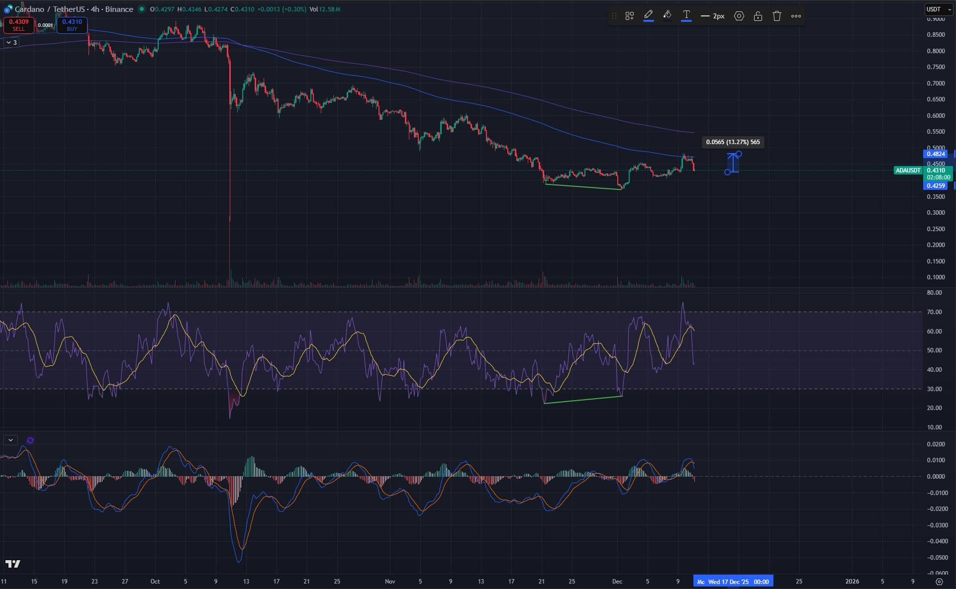 On the 4-hour timeframe, ADA pumped roughly 13% immediately after the FOMC decision, retesting the lower band of the 200-day EMA and SMA. Momentum stalled at that level, which was rejected, pushing the price back toward the day’s opening. This kind of choppy movement is common around FOMC decisions and does not signal that ADA’s recovery attempt is over.