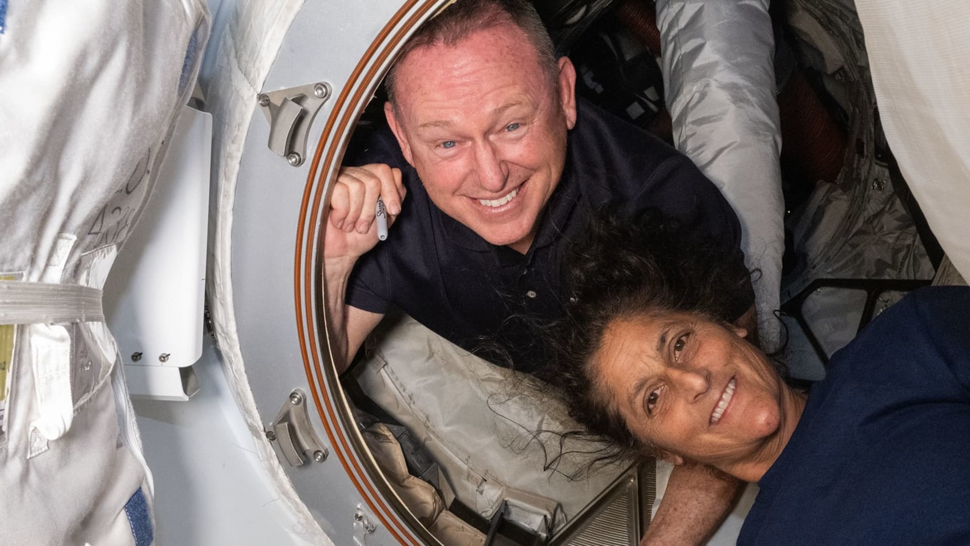 NASA astronauts Butch Wilmore, left, and Suni Williams pose inside the hatch connecting Boeing’s Starliner to the International Space Station on