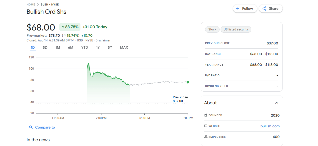 BLSH crypto stock traded for $37 a share during the IPO. This valuation was way above the expected $32 to $33 range and the initial $28 to $31 projected. The stock opened at $90 before soaring to $118 and closing at $68. Even at this valuation, BLSH investors were up 83% from the IPO price. Investors who sold at peaks had over 200% in net gains. At its peak, Bullish was valued at over $17 billion.