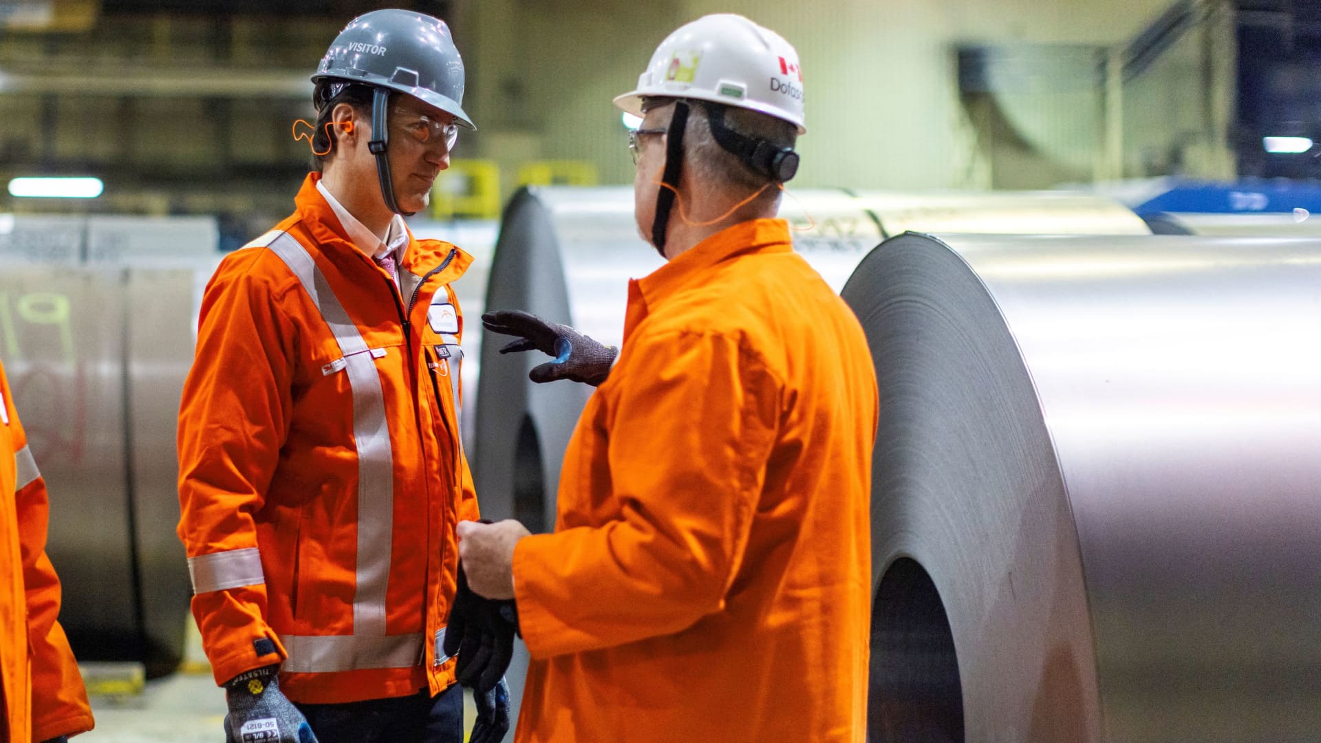 Canadian Prime Minister Justin Trudeau tours the galvanizing line at ArcelorMittal Dofasco in Hamilton, Ontario, Canada Feb. 14, 2025.