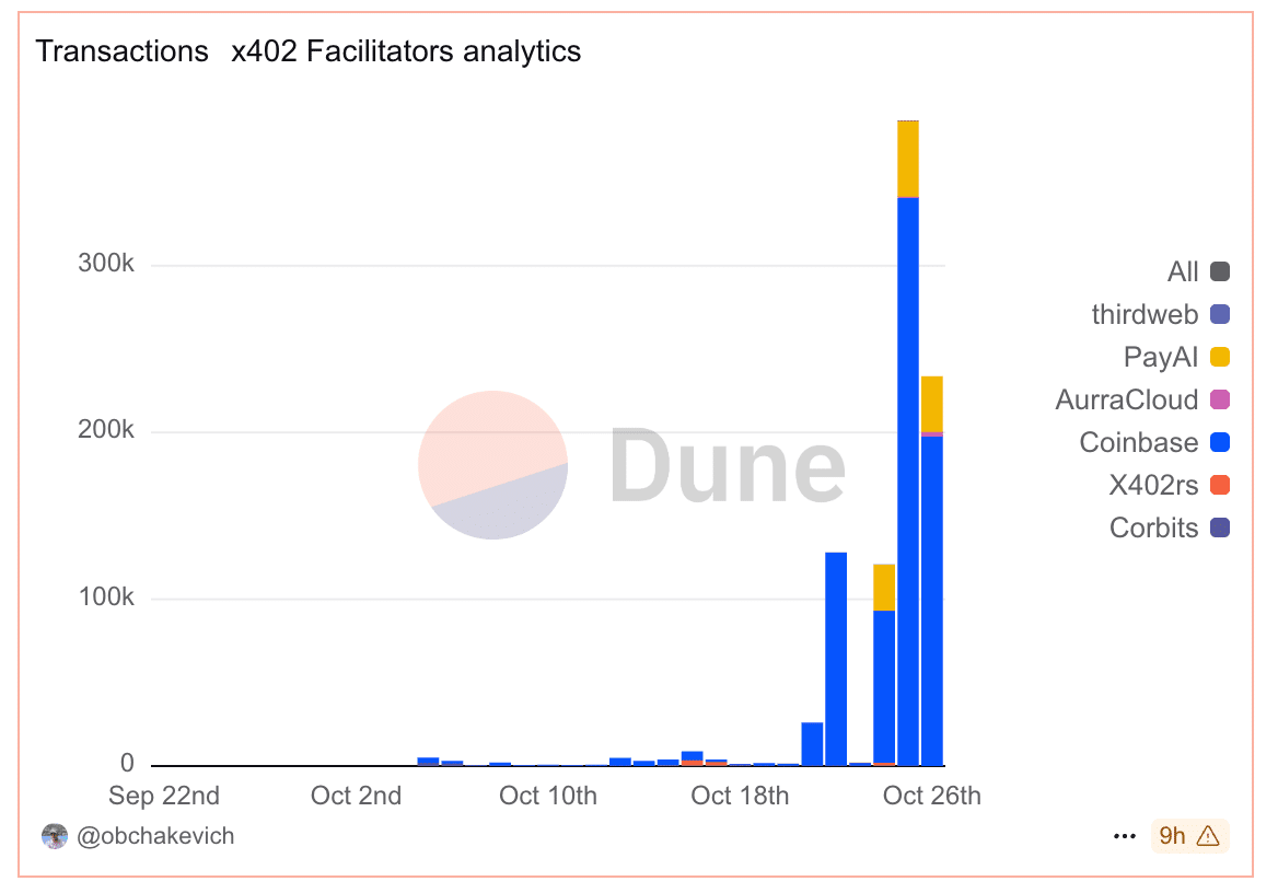 According to Dune Analytics, transaction activity on x402, an internet payments protocol launched by Coinbase in May, has jumped more than 10,000% in the past month.