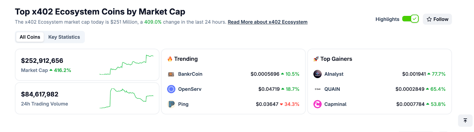 CoinGecko has since added a tracker for the x402 ecosystem, which has rapidly expanded into a $180 million market, jumping 266% in the past 24 hours.