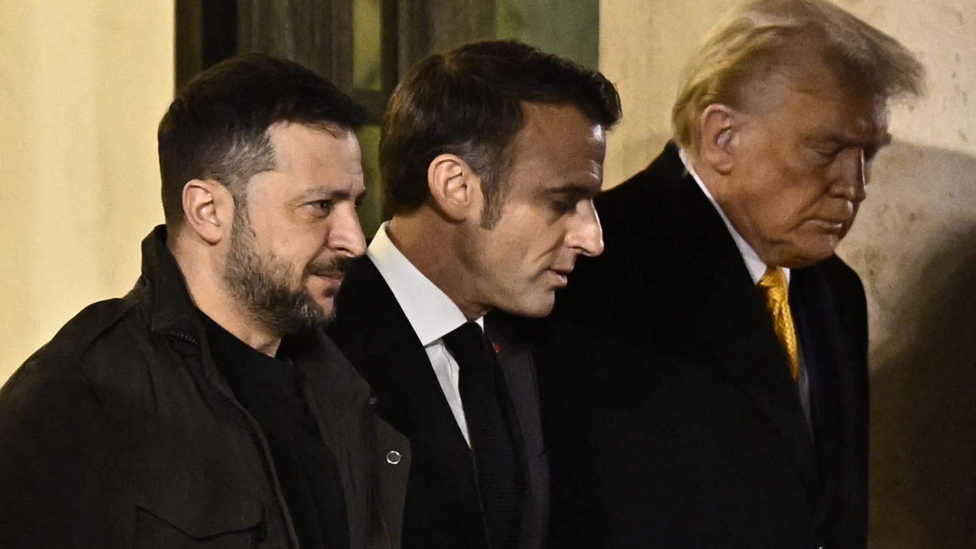 France’s President Emmanuel Macron (C) walks with U.S. President-elect Donald Trump (R) and Ukraine’s President Volodymyr Zelenskyy (L) after a meeting at the Elysee Presidential Palace in Paris on Dec. 7, 2024.