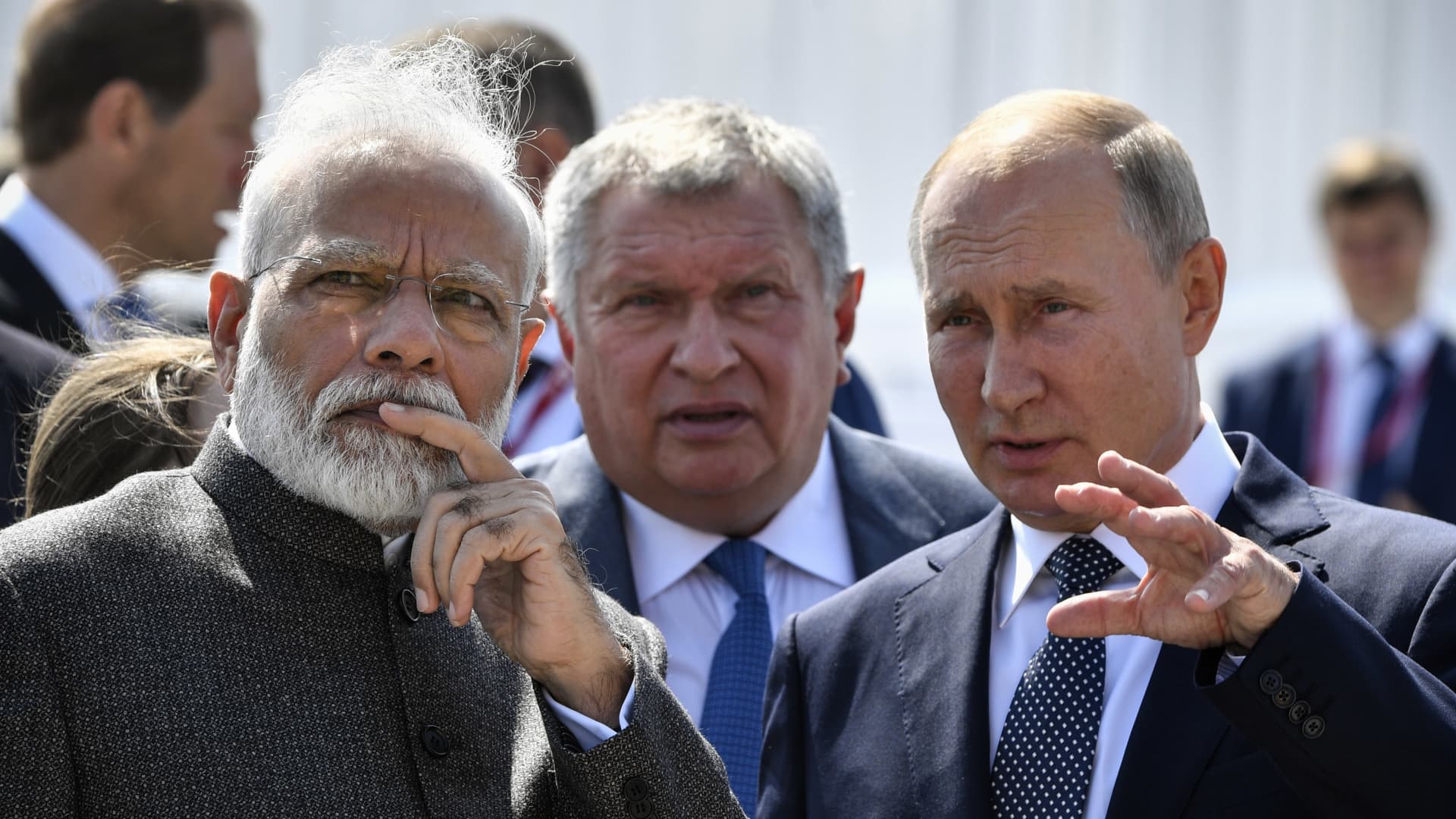Russia’s President Vladimir Putin (R) speaks with India’s Prime Minister Narendra Modi (L) during a visit to the shipyard Zvezda, as Rosneft Russian oil giant chief Igor Sechin (C) accompanies them, outside the far-eastern Russian port of Vladivostok on September 4, 2019, ahead of the start of the Eastern Economic Forum hosted by Russia.