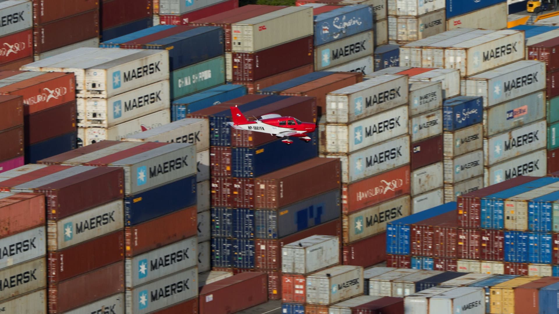 Aerial view of trucks queueing next to the border wall before crossing to the United States at Otay commercial port in Tijuana, Baja California state, Mexico, on Jan. 22, 2025.