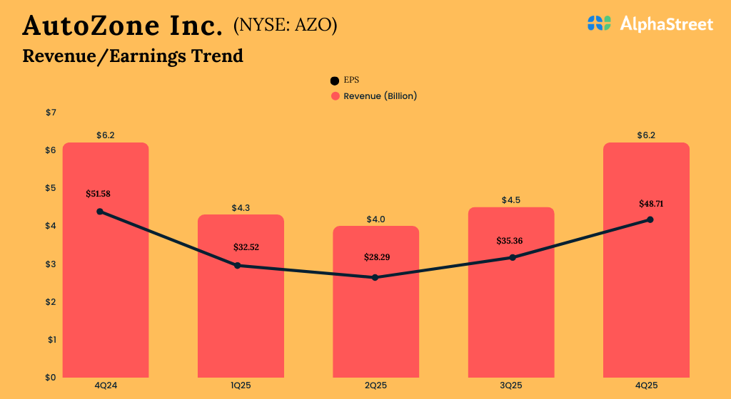 AutoZone, Inc. (NYSE: AZO) reported its fourth quarter 2025 earnings results today.