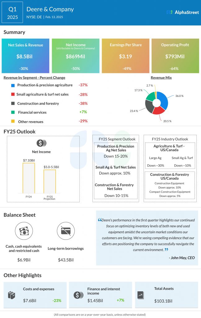 The Deere & Company (NYSE: DE) reported its first quarter 2025 earnings results today.