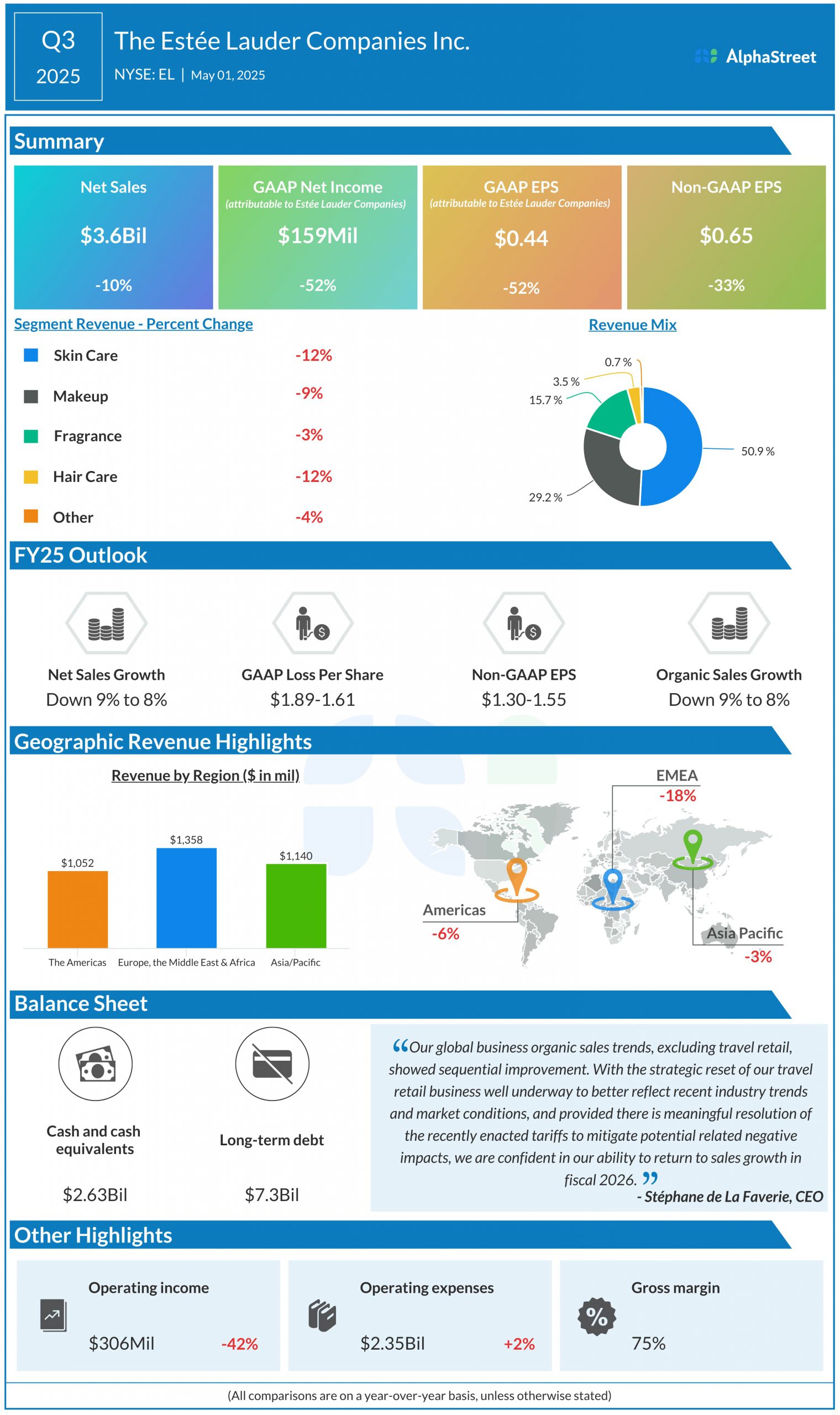 The Estee Lauder Companies Inc. (NYSE: EL) on Wednesday announced financial results for the fourth quarter of fiscal 2025, reporting a decline in sales and adjusted earnings. Fourth-quarter net sales decreased 12% to $3.41 billion from $3.87 billion in the year-ago quarter. Organic sales declined 13% during the three months. Earnings, on an adjusted basis, … Read more