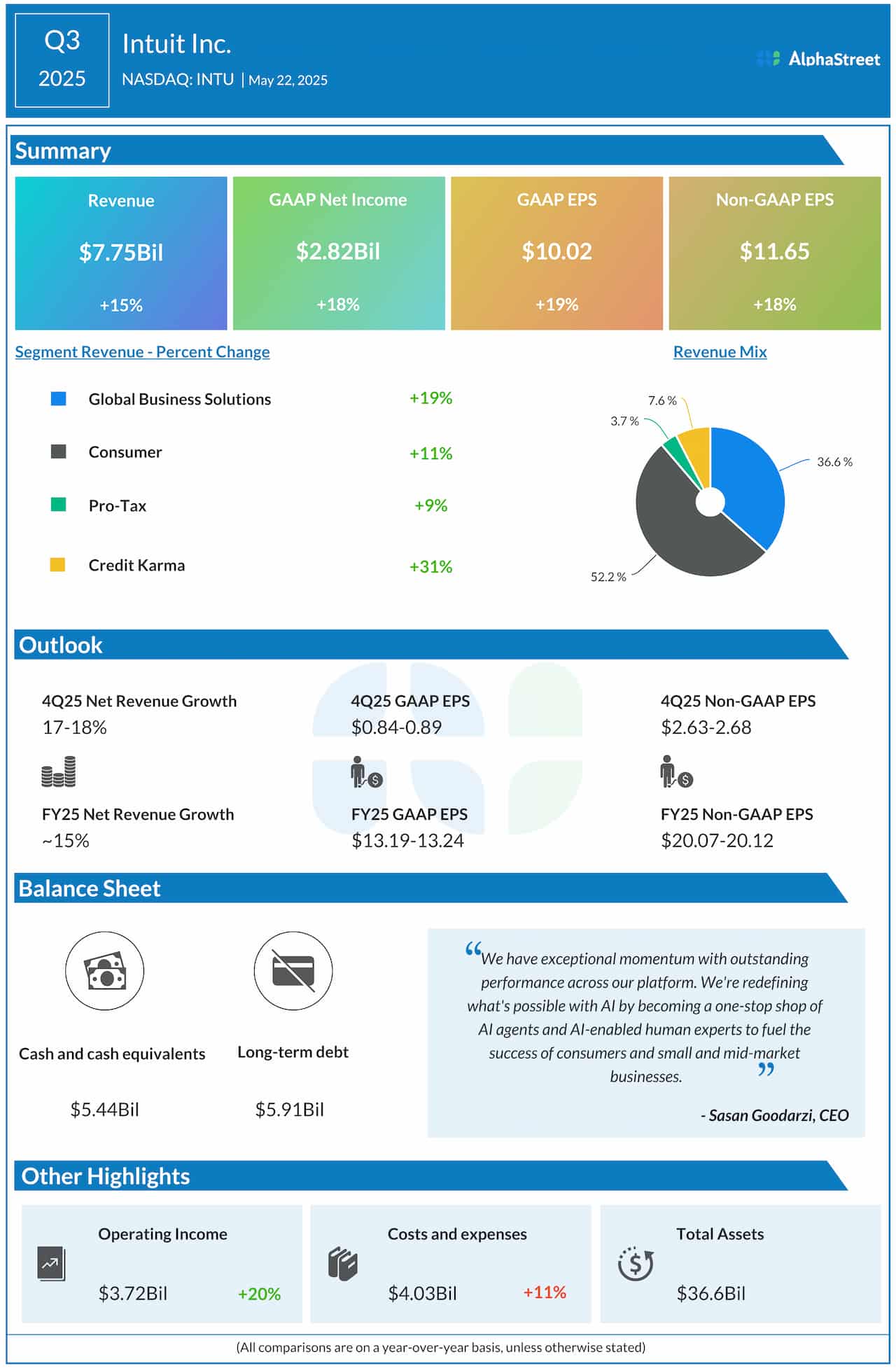 Financial technology company Intuit Inc. (NASDAQ: INTU) on Thursday reported stronger-than-expected earnings for the fourth quarter of 2025. Revenues increased 20%. The Mountain View-headquartered company’s fourth-quarter revenue was $3.83 billion, compared to $3.18 billion in the corresponding quarter a year earlier. On an adjusted basis, earnings came in at $2.75 per share in the July … Read more