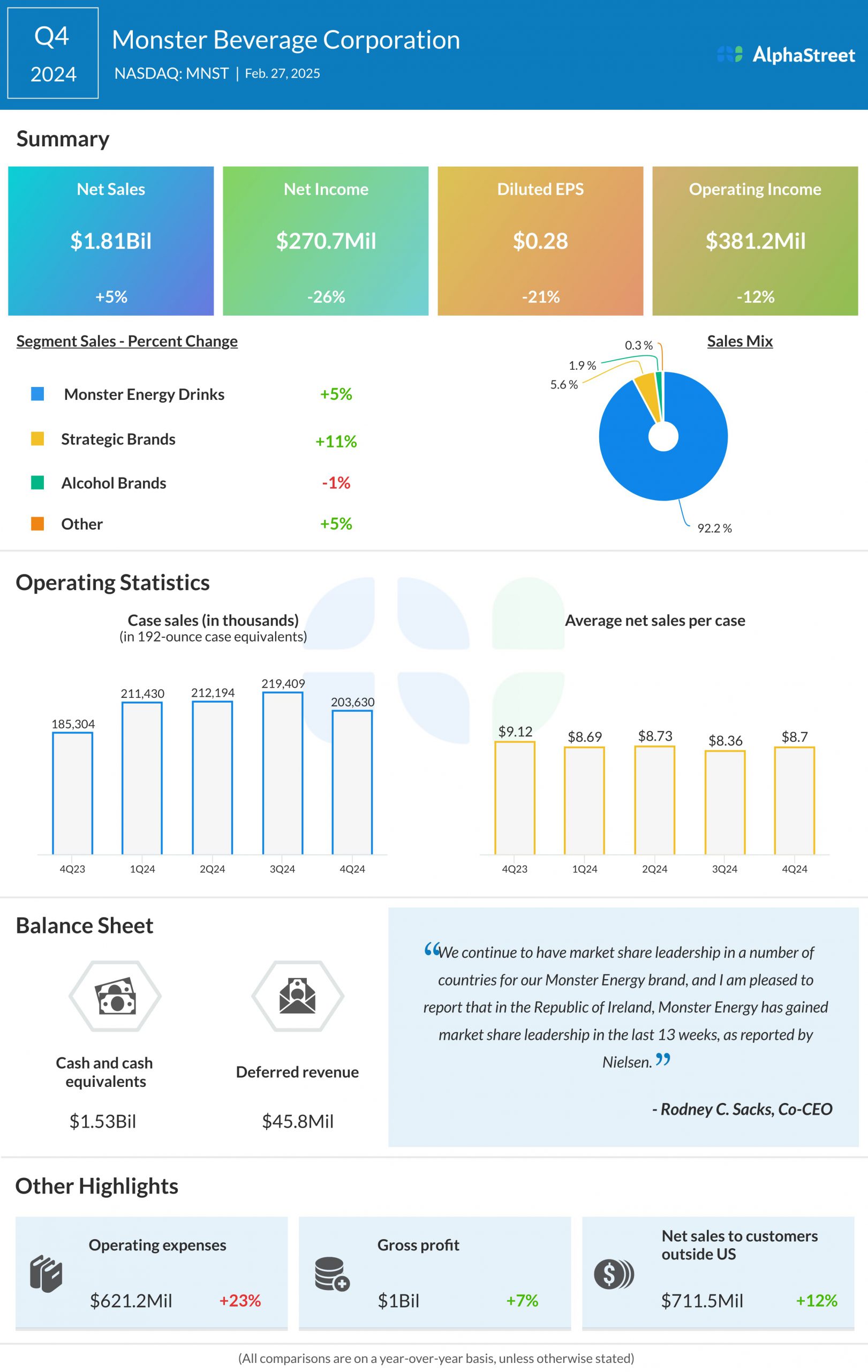 Monster Beverage Corporation (NASDAQ: MNST) on Friday announced earnings for the second quarter of fiscal 2025, reporting an increase in sales and adjusted profit. Second-quarter net sales increased 11% percent to $2.11 billion from $1.90 billion in the same period last year. On a currency-adjusted basis, sales were up 11.4%. Adjusted earnings, exclusive of litigation … Read more