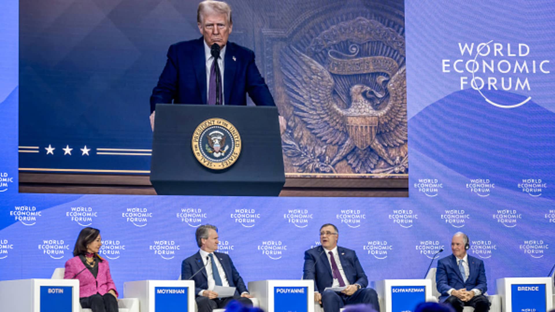 U.S. President Donald Trump on screen during his address by video conference at the World Economic Forum annual meeting in Davos on Jan. 23, 2025.