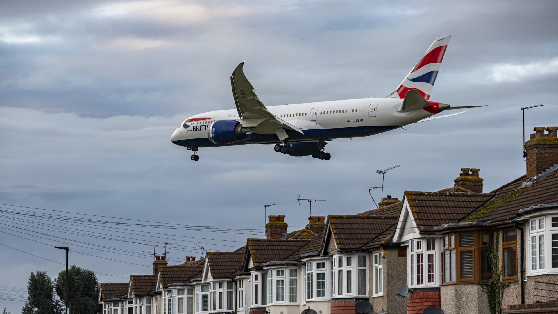 British Airways Boeing 787-8 Dreamliner aircraft spotted flying on final approach over the roofs of the houses of Myrtle avenue for landing at London Heathrow Airport LHR in the UK.