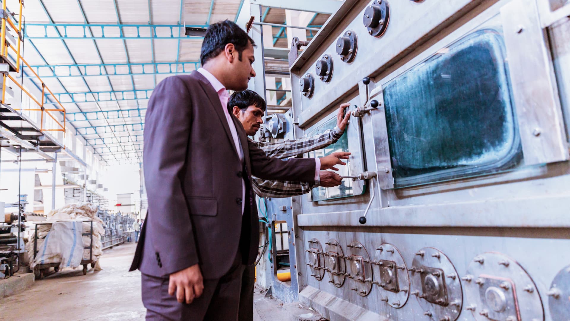 Business, India, Factory – Young Businessman with his factory floor supervisor inspecting the newly installed heavy machinery at a textile factory.