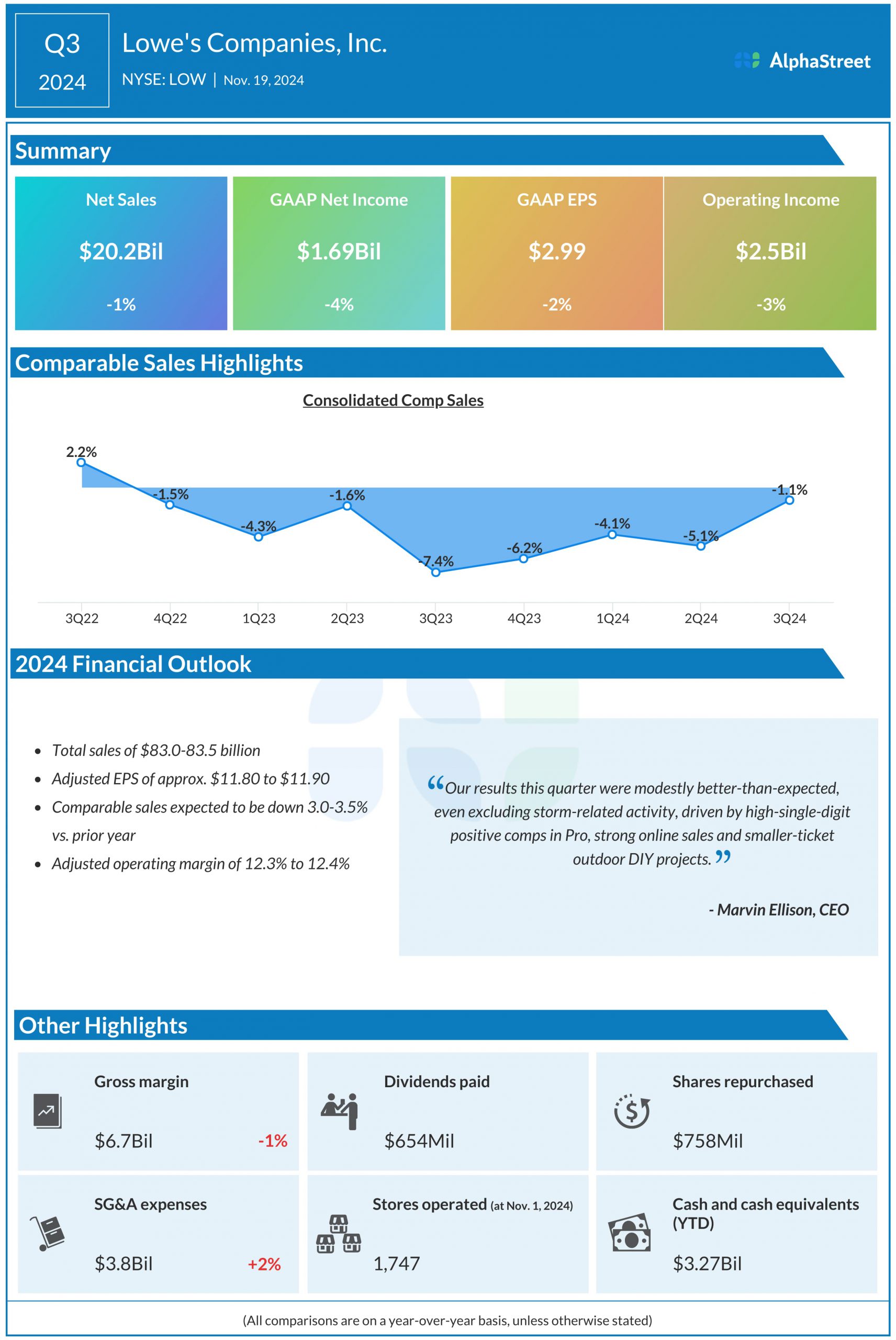 Lowe’s is likely to continue to face pressure from softness in demand for bigger-ticket discretionary projects, particularly in the do-it-yourself, or DIY customer segment. A large part of the company’s sales come from the DIY customer, so weakness in this area can have a meaningful impact on its performance. Last quarter, storm-related sales managed to offset some of the pressure on the top line. The company anticipates modest storm-related demand in the fourth quarter of 2024.