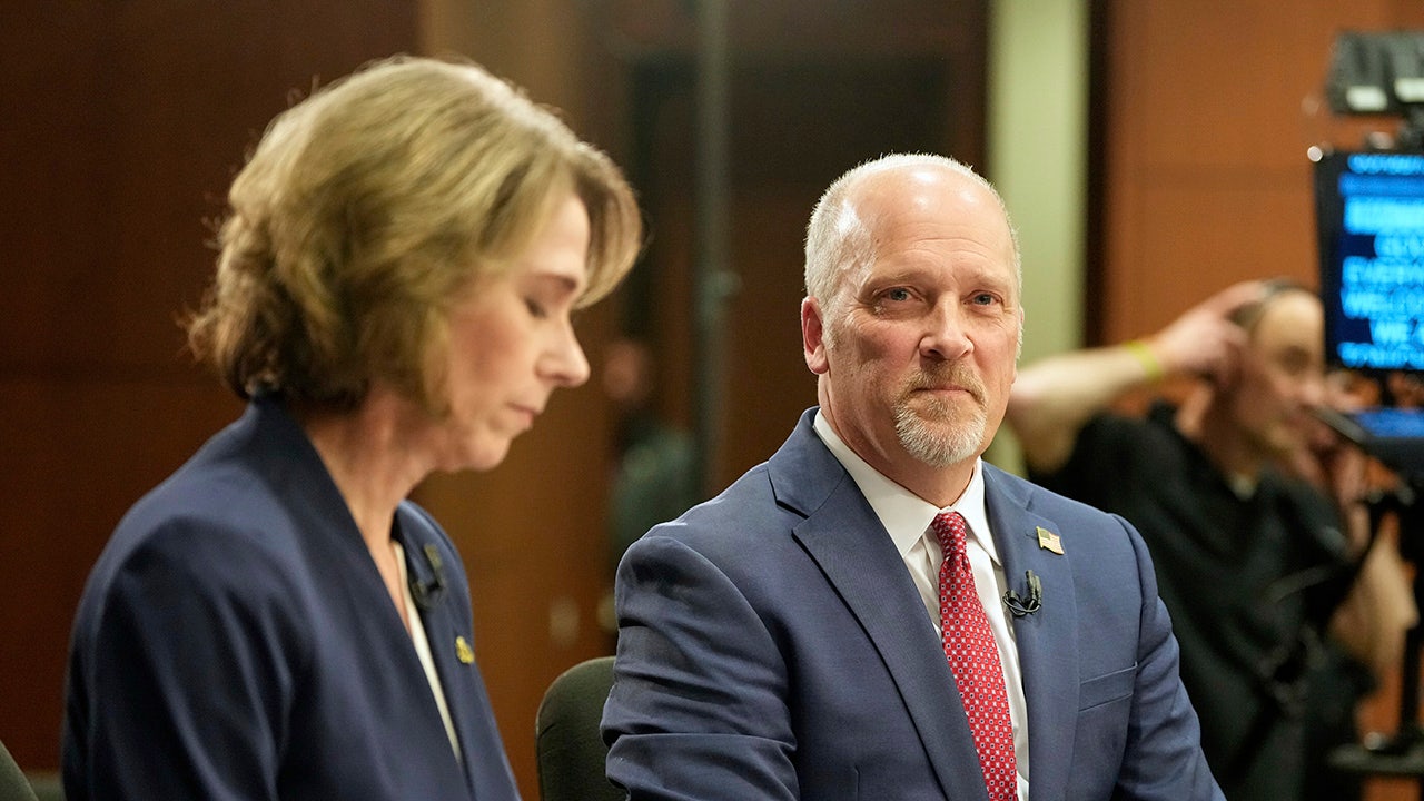 Wisconsin Supreme Court candidates Brad Schimel and Susan Crawford before a televised debate on March 12, 2025, in Milwaukee. (AP Photo/Morry Gash)