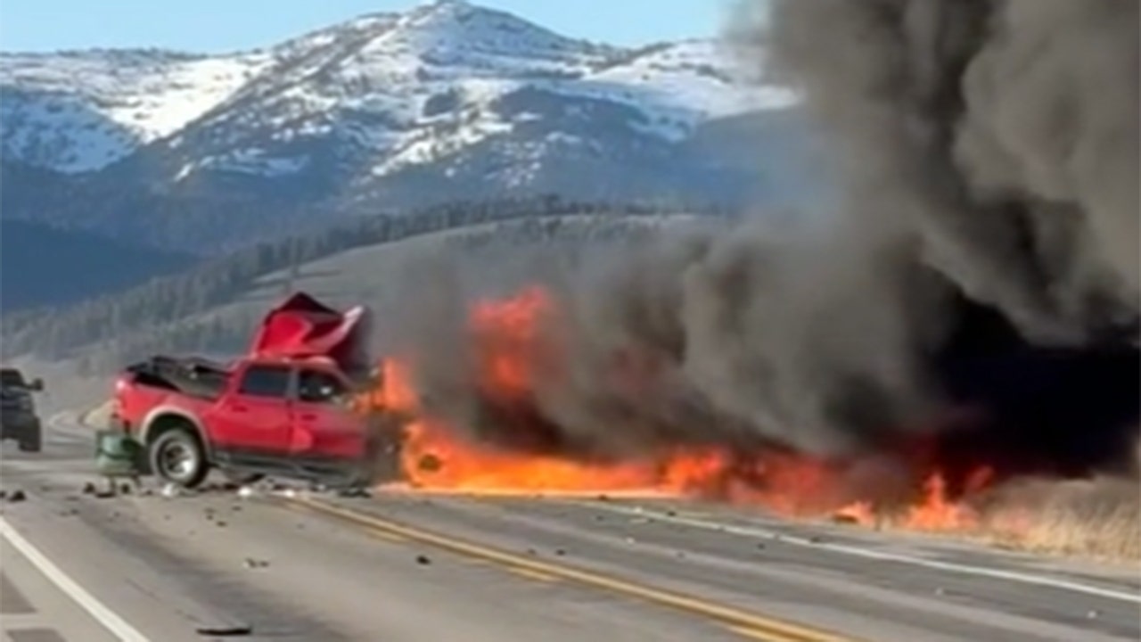 The aftermath of a May 1 crash between a tour van and pickup truck along U.S. Highway 20 near Henry’s Lake State Park in eastern Idaho. (Roger Merrill/TMX)
